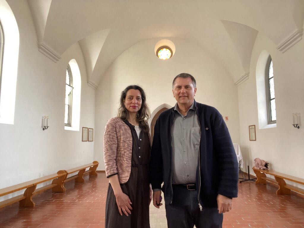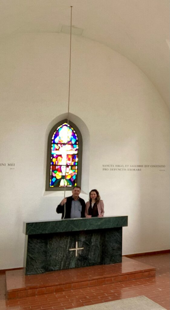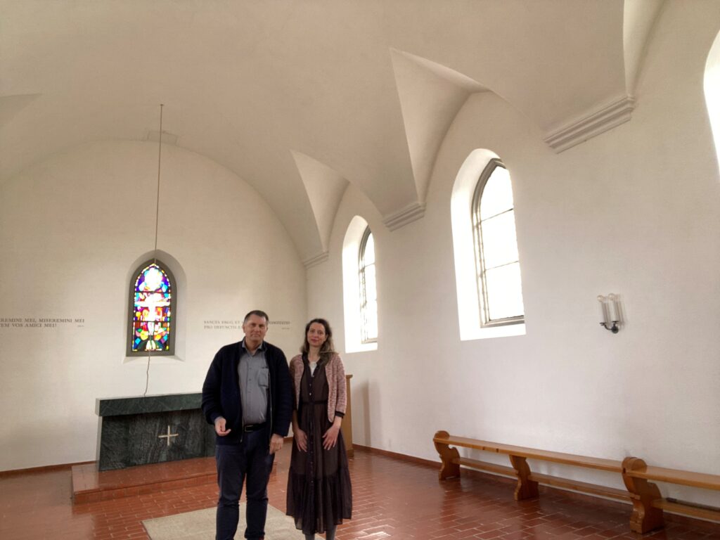 Abb. 2: Mit der grossartigen Michèle Perret in der Ölbergkapelle. Sie erinnert an den Ölberg (Gethsemane), den Ort, an dem sich im stillen Innern entscheidet, was im Aussen sichtbar wird. Von der Arche zum Ölberg. Vom Wasser zur Stille. Die Ölberg-Kapelle ist ein schlichter Bau von 1866.