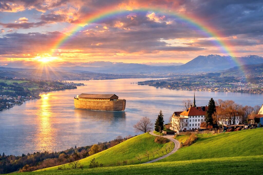 Abb. 3: Arche auf dem Zugersee unter dem Regenbogen. Das Zeichen des Bundes (Genesis 9) und Sinnbild von Rettung, Übergang und göttlicher Führung.