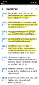 Abb. 2: Transkript-Auszug aus dem Referat von Dr. Roger Liebi, Henoch und die Sintflut. Vortragswochende in Annaberg-Buchholz 15.-17.11.2024. Minute 58.45 – 1.01.30 Der Prophet Henoch wurde vor der Sintflut entrückt und Henoch hat vorsintflutlich das zweite Kommen des Messias in Macht und Herrlichkeit als Richter der Welt vorausgesagt. Das ist grandios! Henoch hatte so eine heilsgeschichtliche Sicht gehabt und ist mit Gott gewandelt. Henoch hat die Pläne Gottes gekannt.