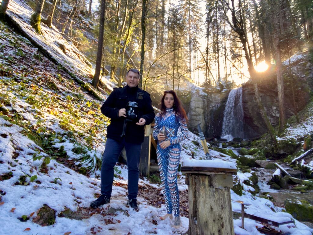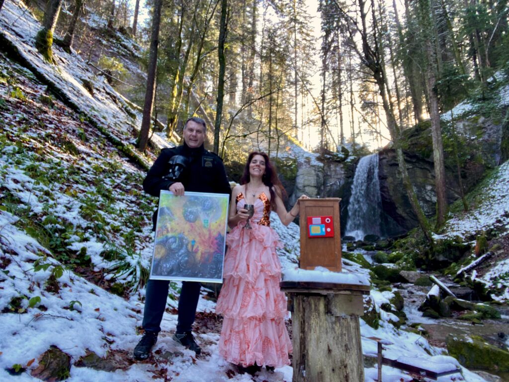 Abb. 1: Das erste Alchemie-Experiment mit der überzeugenden Janine Landtwing (PhD): Die Transformation von Darth Vader zum aufsteigenden Schmetterling klappte auf anhin. Zu einem späteren Zeitpunkt wird der grossartige Schmetterling Janine Landtwing, mit dem Heiligen Gral, noch Wasser aus den Schwarzenbach-Wasserfall schöpfen, denn Darth Vader (Lars Rominger) darf keinen Rückfall ins Böse erleiden.